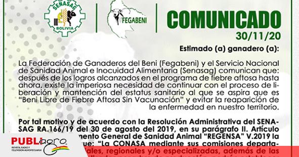 La Federación de Ganaderos del Beni (FEGABENI) y el Servicio Nacional de Sanidad Animal e inocuidad Alimentaria (SENASAG) acordaron mantener por imperiosa necesidad el proceso de «liberación y mantención del status sanitario de un Beni Libre de Fiebre Aftosa, sin vacunación, y evitar la reaparición de la enfermedad en ese departamento». Según un comunicado emanado por Fegabeni.