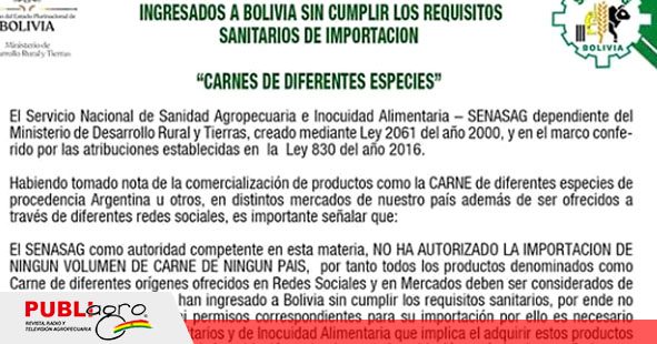 El Servicio Nacional de Sanidad Agropecuaria e Inocuidad Alimentaria (SENASAG) informó a la comunidad nacional que «no ha autorizó la importación de ningún volumen de carne de ningún país» y formuló un llamado a las personas para que denuncien cualquier anormalidad en las jefaturas departamentales del organismo a nivel nacional.