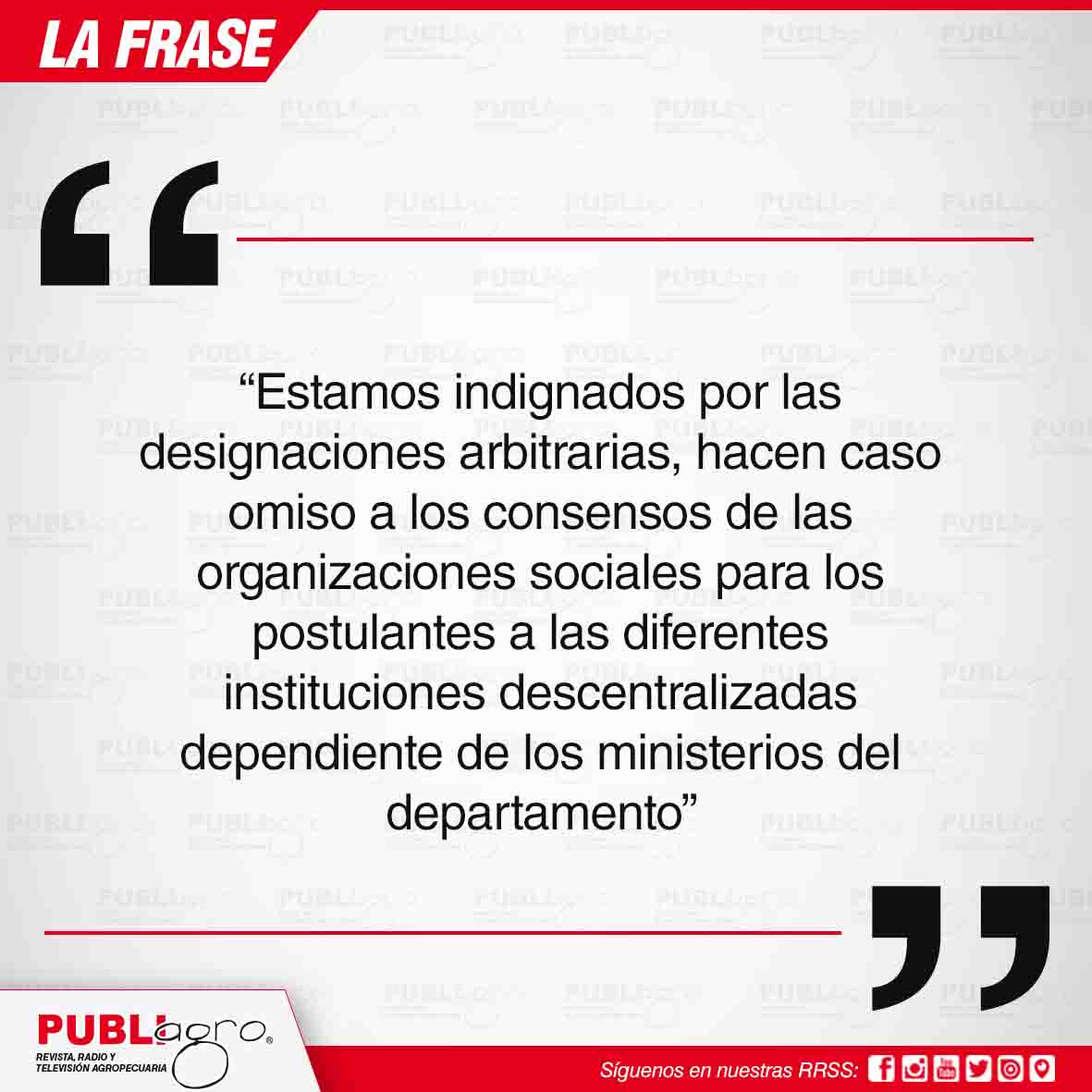 «Estas tres personas están cometiendo errores imperdonables, no puede ser que propongan el nombre de personas  golpistas y pititas dentro de las instituciones, es un avasallamiento a la institucionalidad. Con la unidad de los pueblos y de las organizaciones sociales logramos obtener nuevamente el Gobierno Central, de esa manera le pedimos ministro de Desarrollo Rural y Tierras, Edwin Ronald Characayo, que destituya del cargo a la actual directora del INRA».