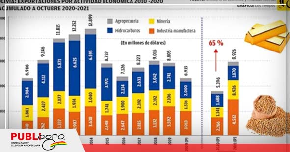 A octubre de 2021, actividades económicas como la industria manufacturera, minería, hidrocarburos y agropecuaria impulsaron el incremento del valor de las exportaciones bolivianas en 65 por ciento. Aunque el Gobierno destaca el aumento de los ingresos, un economista afirma que todo surge a consecuencia de la reactivación económica mundial tras la pandemia del coronavirus.
