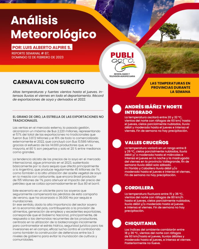 Altas temperaturas y fuertes vientos hasta el jueves. Intensas lluvias el viernes en todo el departamento. Récord de exportaciones de soya y derivados el 2022.