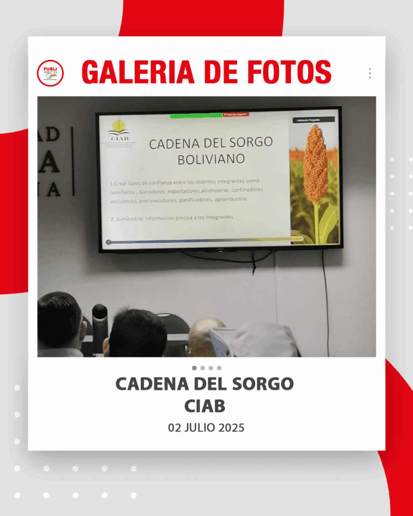 Agenda de eventosSocialera 📷Galería de fotos | Comité Cadena del Sorgo Por Publiagro - 03/07/2025 0 7468 FacebookTwitterPinterestWhatsApp Se conformó el comité qué representará a esta iniciativa del Colegio de Ingenieros Agrónomos de Bolivia con la creación de la Cadena del Sorgo qué involucra a todos los sectores relacionados con este producto