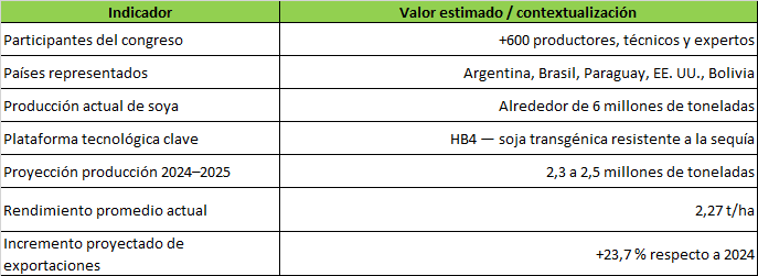 El congreso —que se desarrolla el 25 y 26 de agosto en el Salón Chiquitano de Expocruz— reúne a más de 600 asistentes y delegados de Argentina, Brasil, Paraguay, Estados Unidos y Bolivia. Será una plataforma para debatir temas como manejo sostenible del suelo, fertilidad, control de plagas, nutrición vegetal, agricultura de precisión y biotecnología aplicadas al cultivo de soya.