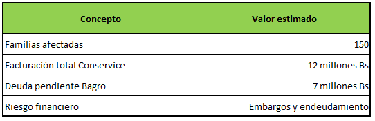 Melisa Barba, representante de 150 familias bolivianas aglutinadas en la empresa Conservice, denunció que Bagro adeuda 7 millones de bolivianos desde 2023 por servicios de desmonte en 5.000 hectáreas. La facturación total ascendió a 12 millones de bolivianos, pero el pago nunca se completó.