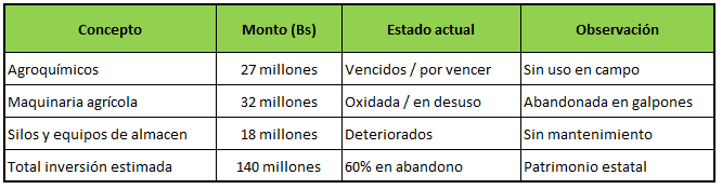 La situación de B-Agro revela un problema estructural de gestión y corrupción en empresas estatales: mientras agricultores reclaman pagos para sobrevivir, el Estado acumula pérdidas millonarias en insumos y equipos improductivos.