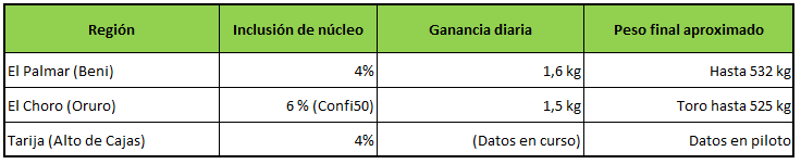 Un enfoque similar se está desarrollando en el municipio de El Choro (Oruro), donde el INIAF aplicó Confi50 al 6 % de núcleo proteico en raciones de confinamiento para 30 cabezas, logrando ganancia diaria entre 1,5 kg, con toros Holando de hasta 525 kg. En el Valle Central de Tarija (Alto de Cajas, San Lorenzo), un ciclo de engorde experimental de 60 días también incluyó un núcleo al 4% de fósforo y contó con la participación activa de familias productoras, técnicos y autoridades locales.