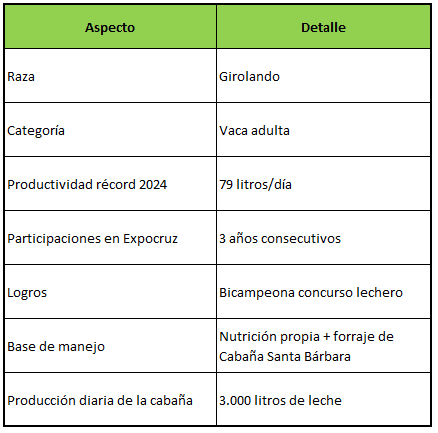Catalina no es nueva en las pistas. Durante los últimos tres años ha competido en este torneo, destacándose por su productividad y resistencia. En la edición pasada impuso un récord de 79 litros de leche, cifra que volvió a superar este 2025, ratificando su lugar como una de las vacas más productivas de Bolivia.