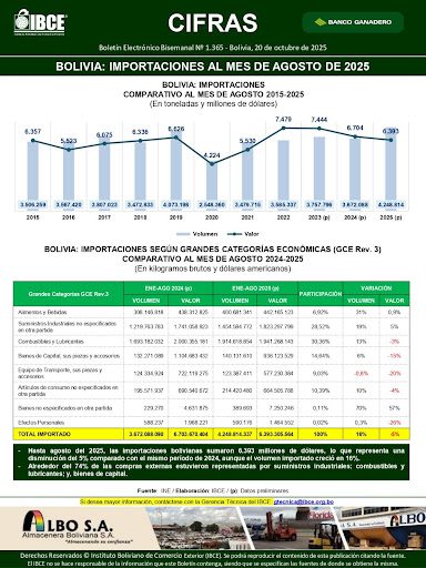 Hasta agosto de 2025, las importaciones bolivianas alcanzaron un valor total de 6.393 millones de dólares, lo que representa una disminución del 5% respecto al mismo período del año anterior, según datos del Instituto Nacional de Estadística (INE). Sin embargo, el volumen físico de las compras externas registró un incremento del 16%, lo que refleja una tendencia marcada por la caída de precios internacionales y una mayor demanda de bienes esenciales.