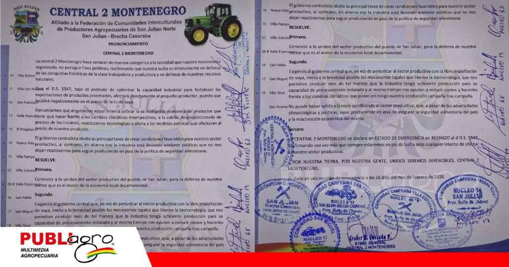 La Central 2 Montenegro, que agrupa a productores del municipio de San Julián, rompió el silencio y anunció que se declara en movilización en rechazo al Decreto Supremo 5547, medida que, según denuncian, amenaza la estabilidad del pequeño productor boliviano y el precio justo de la soya. La organización considera que esta norma, presentada bajo el argumento de “optimizar exportaciones”, en realidad favorece a la industria y castiga a quienes trabajan la tierra día a día.