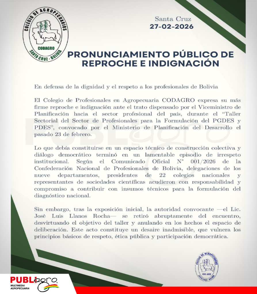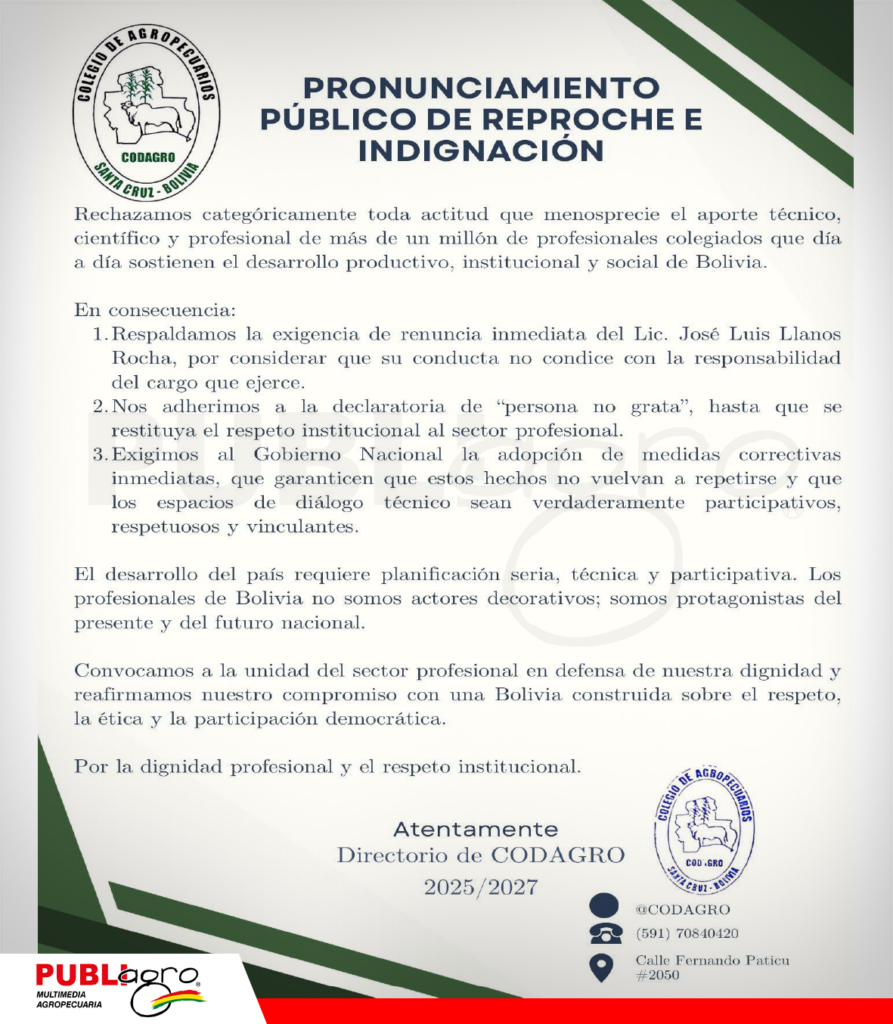 “Los profesionales de Bolivia no somos actores decorativos; somos protagonistas del presente y del futuro nacional”, afirmó CODAGRO, mientras que la Confederación Nacional de Profesionales reafirmó su disposición al diálogo serio y constructivo, siempre que se realice en un ambiente de respeto y responsabilidad institucional.