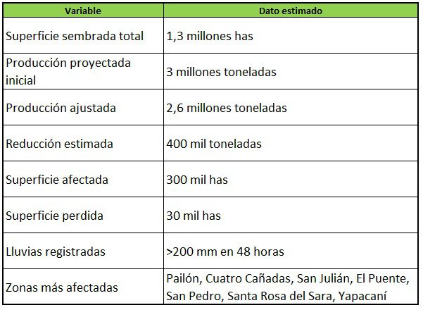 Según la evaluación de Anapo, al menos 300 mil hectáreas presentan algún grado de afectación. De estas, aproximadamente 30 mil hectáreas se consideran pérdidas totales, mientras que el resto evidencia mermas importantes en el rendimiento. Esta situación refleja una afectación territorial diferenciada, donde las zonas con menor drenaje o mayor acumulación de agua presentan mayores daños.